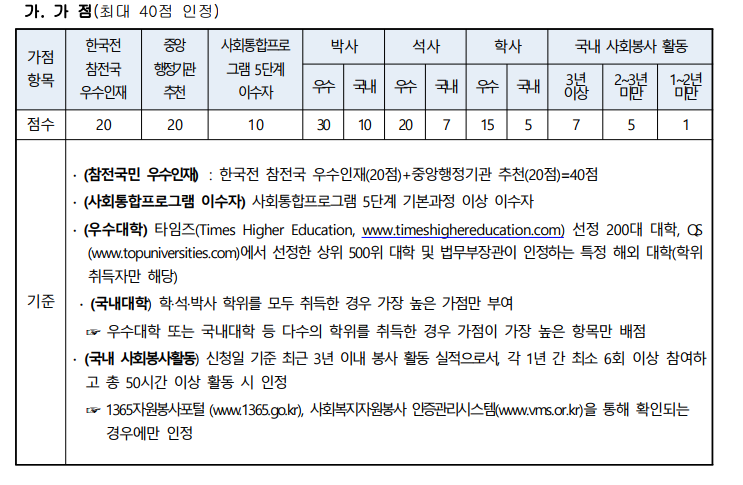 e) 가점항목 (최대 40점)