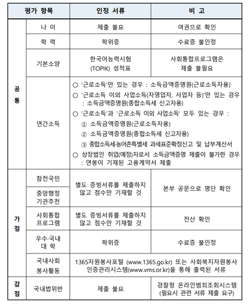 한국전 참전국 우수인재, 중앙행정기관 추천, 사회통합프로그램 이수, 국내외 우수대학 학위 취득, 국내 사회봉사활동 등