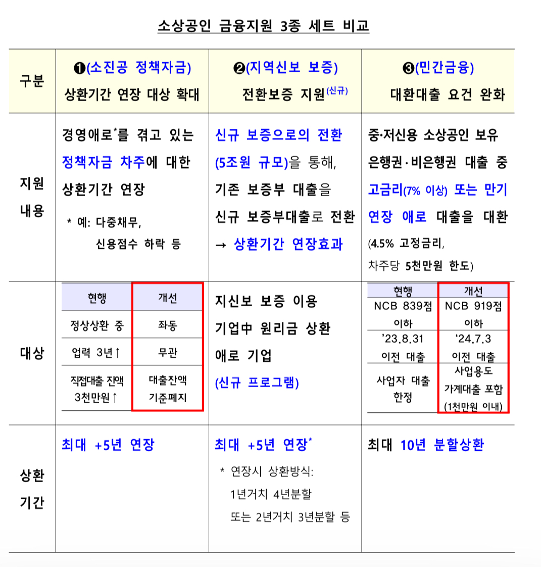 • 고금리 대출 전환 프로그램: 은행이나 비은행권에서 받은 고금리 대출(7% 이상)을 소상공인시장진흥공단의 저금리 대출(4.5% 고정금리, 10년 분할 상환)로 전환할 수 있도록 돕는 프로그램을 마련했습니다. 이 프로그램을 통해 많은 소상공인들이 금리 부담을 줄이고, 경영에 더 집중할 수 있을 것입니다.
