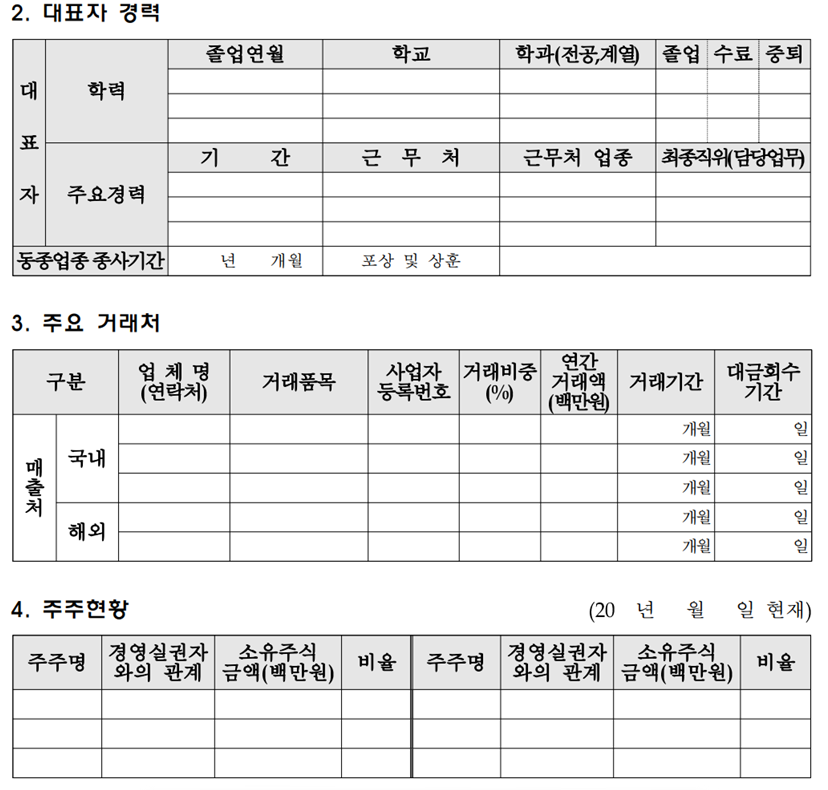 대표자의 학력 및 경력을 작성해 주시돼, 수상 경력이 있다면 반드시 작성해 주세요. 주요 거래처는 현재 매출 발생 중인 거래처 목록을 상세하게 작성해 주시면 됩니다. 특히 해외 매출처의 경우 가능한 많이 써주셔야 수출을 주력으로 하는 제조업임을 어필할 수 있습니다. 수출 주력 관점은 정부지원사업에서 가장 인상 깊게 보는 항목으로 비록 현재 준비 중이더라도 해당 부분을 풍부하게 작성해 주시는 게 좋습니다. 해외 매출처가 없어서 고민이시거나, 해외 매출처가 어디인지 모르신다면, 우리가 많이 들어본 아마존, 라쿠텐, 알리익스프레스, 등등 해외 쇼핑몰 등이 이에 해당하고, 현재 입점해 있지 않더라도 입점 예정 중으로 작성하셔서 수출을 준비 중임을 알려주시면 좋습니다. 현재 법인일 경우 주주현황은 주주명부에 기재된 대로 작성해 주시면 됩니다.