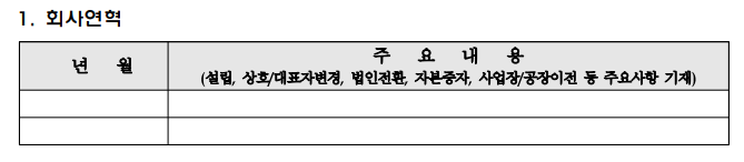 회사연혁 작성 시, 굵직한 회사의 이벤트를 작성해 주시는 게 좋은데요. 예를 들어 기업부설연구소 설립은 언제 했는지, 벤처기업 인증 및 여성기업 인증은 언제 받았는지 등을 작성해 주시면 좋습니다. 가급적 세밀한 작성하여 회사가 계속해서 성장하고 있음을 나타내면 좋습니다!
