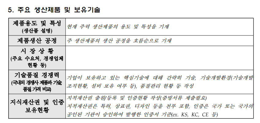 사업 계획서 작성 시 가장 비중 있게 작성하셔야 하는 부분이 바로 주요 생산제품 및 보유 기술 파트입니다. 담당 심사관 입장에서는 제조업만 대상으로 혁신 바우처 신청이 가능하기 때문에 우리 사업장에서 생산하고 있는 제품의 용도 및 특성을 자세하게 알고 싶을 것이고, 사실상 해당 부분이 우리가 제출해야 할 사업계획서의 핵심이라고 할 수 있습니다.