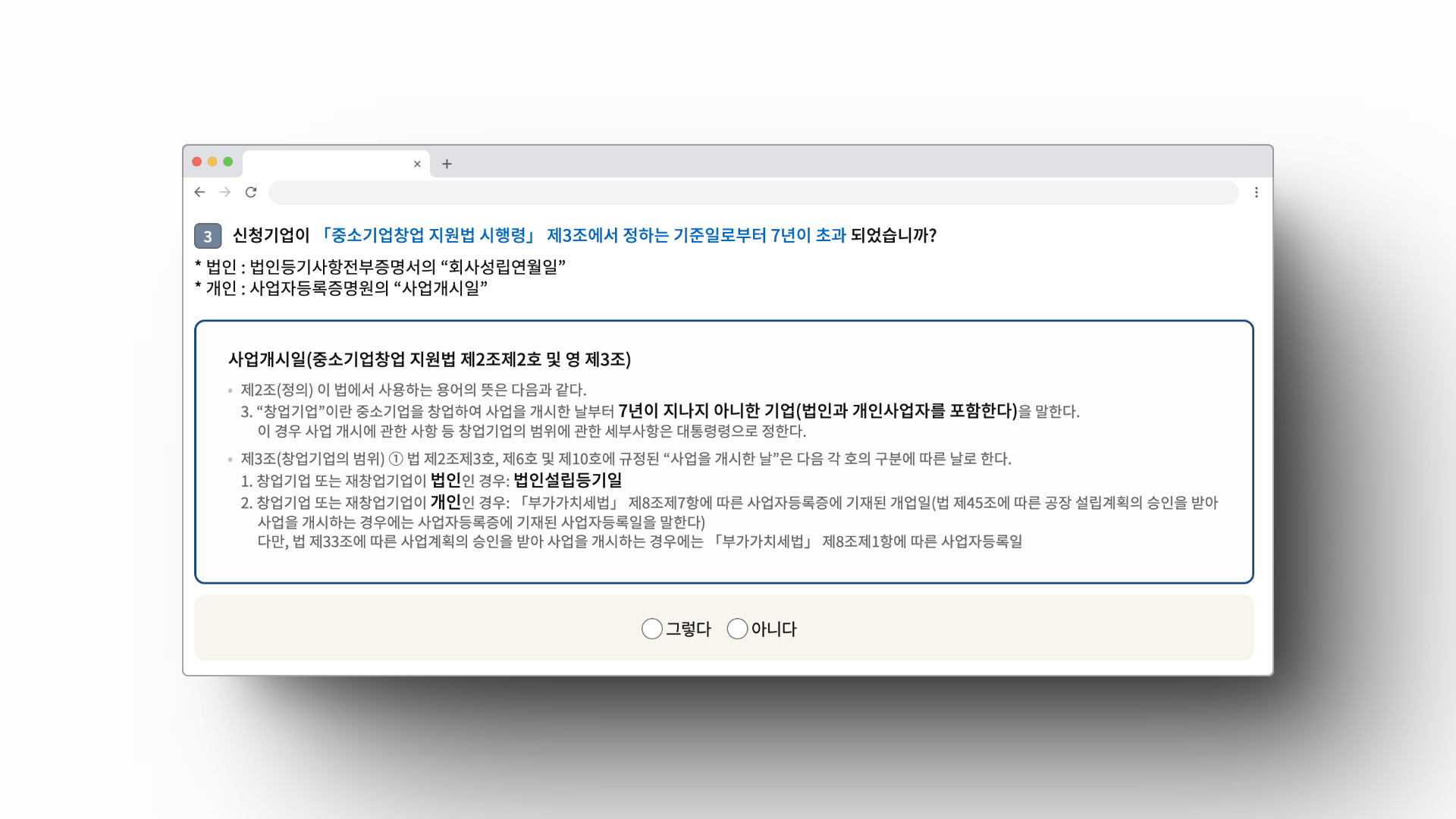 | 사업 개시일 기준 7년 이내 | 개인사업자 : 사업자등록증 상 개업일 기준 법인사업자 : 법인설립등기일 기준 |