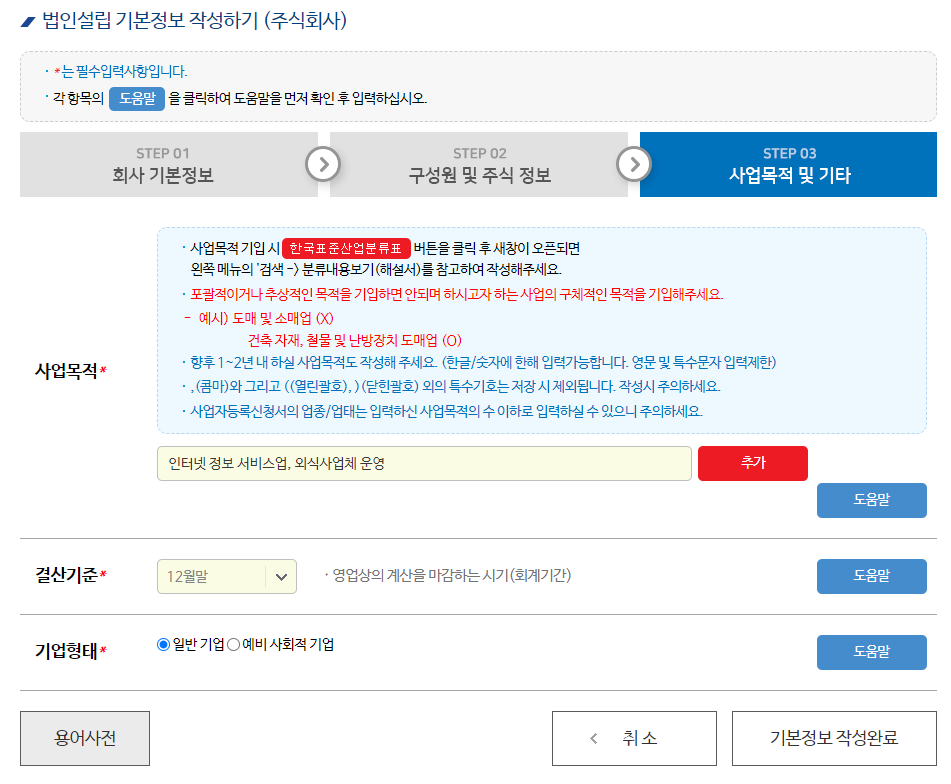 - 설립 목적 작성 시, 한국표준산업분류를 확인해 보는 것도 좋아요.