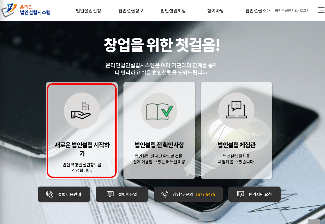 1. 스타트비즈에 접속하여 새로운 법인설립 시작하기 버튼을 누릅니다.