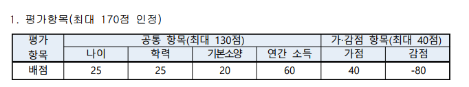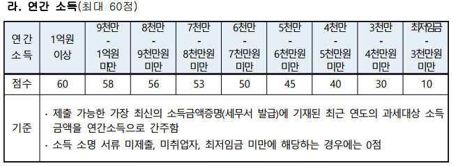 소득평가는 최저 10점 (최저임금~3천만원) 에서 최고 60점 (1억원 이상)으로 부여되며