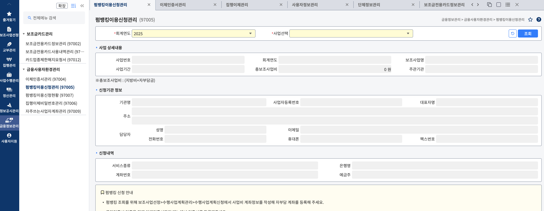 👉 금융정보관리 > 금융사용자환경관리 > 펌뱅킹이용신청관리(97005)